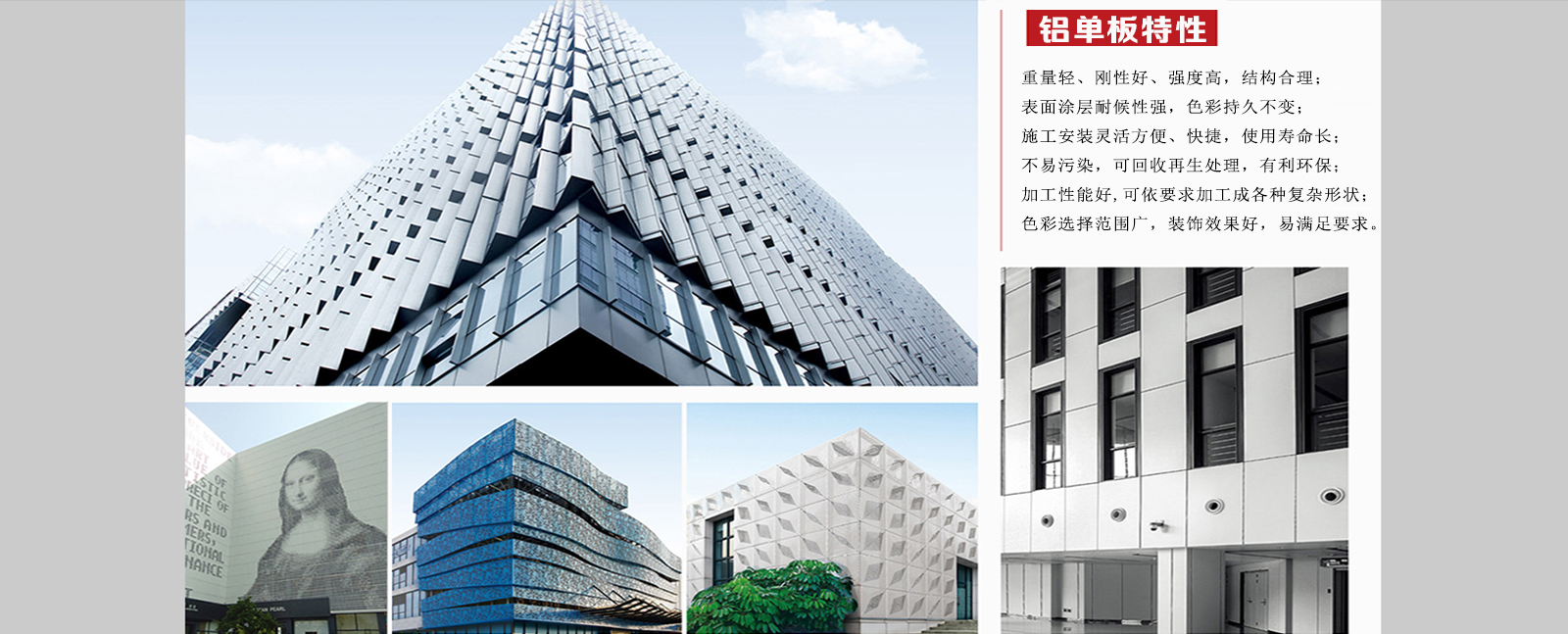 鋁單板工程案例可應(yīng)用于:建筑物外墻、梁柱、門頭、陽臺、雨棚、廣告牌、室內(nèi)建筑裝飾、商業(yè)大樓、別墅…